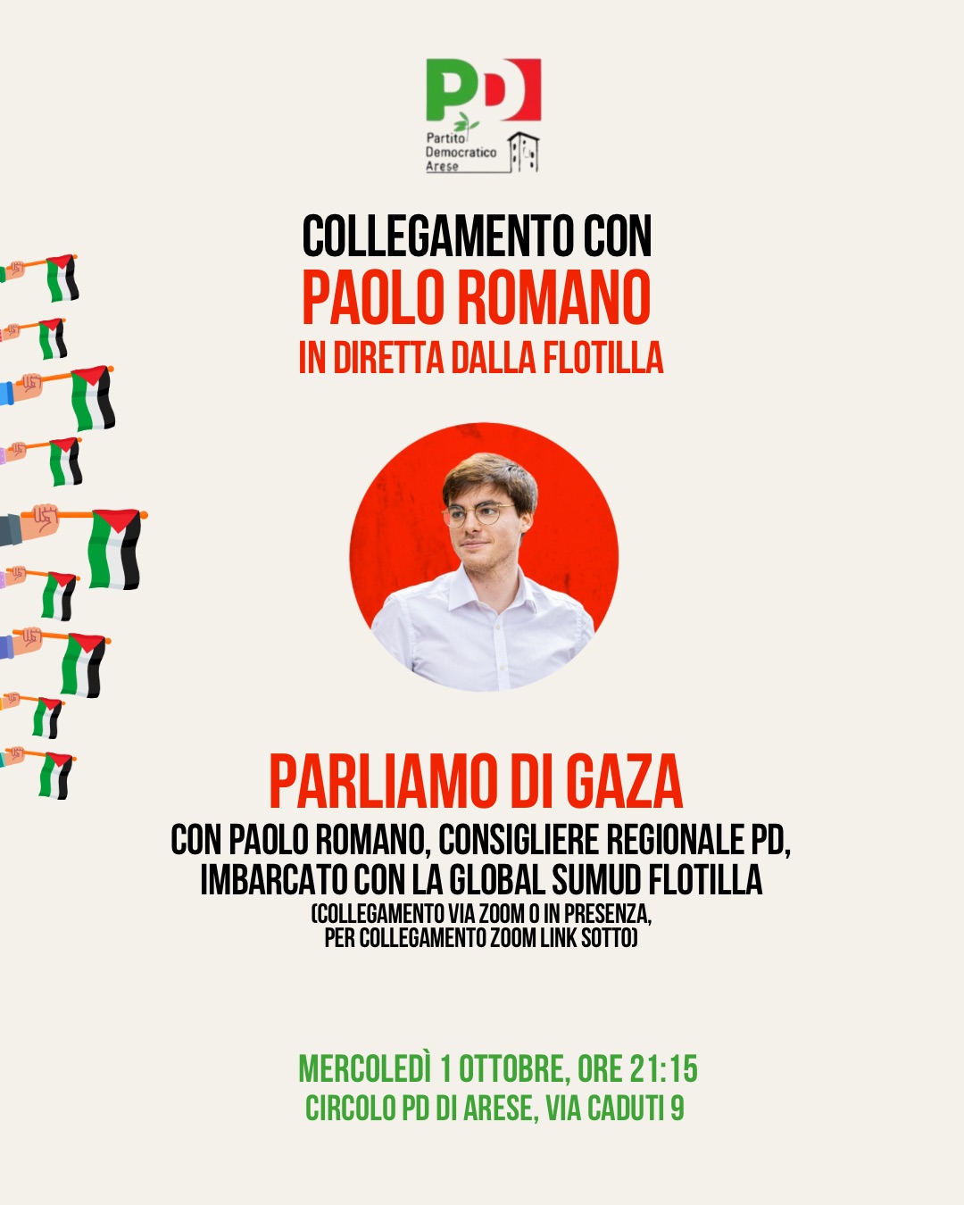 Per questo, per confrontarci su un tema che è di rilevanza mondiale quale il conflitto in Israele che vede soffrire ormai da anni la popolazione palestinese, annunciamo che mercoledì 1 ottobre ore 21.15 ci collegheremo con Paolo Romano, consigliere regionale PD, il quale è imbarcato sulla Global Sumud Flotilla diretta a Gaza.