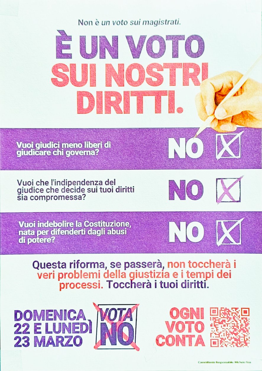 Ciao l'appuntamento di domenica 22 e lunedì 23 è importante e non possiamo far mancare il nostro voto a salvaguardia della Costituzione, contro una riforma che nulla ha a che fare con la soluzione delle criticità della giustizia italiana. Vota ed invita amiche ed amici ad andare a votare NO